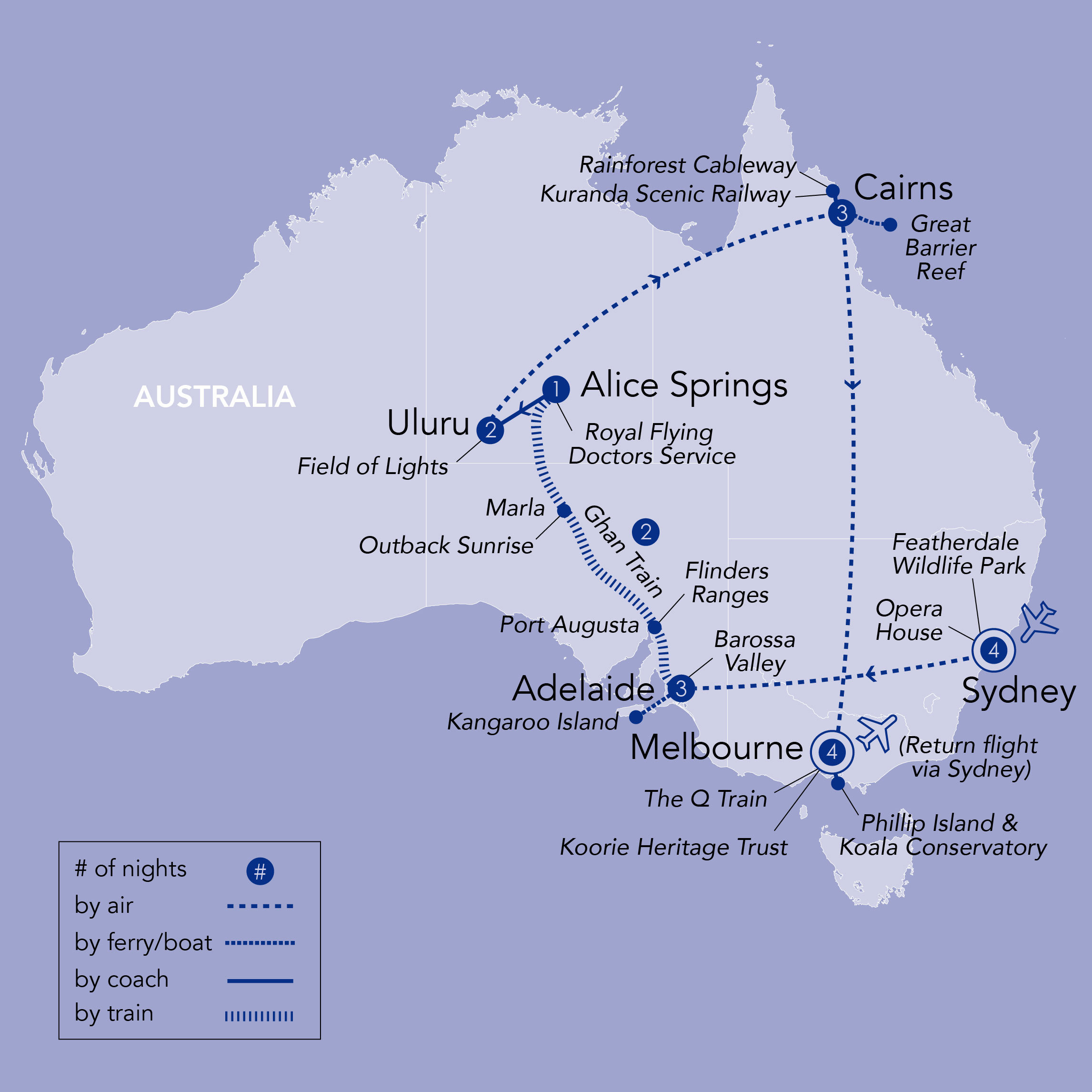 Discover the very best of Australia as you explore breathtaking landscapes, vibrant cities, and unforgettable wildlife experiences. Your journey begins with four nights in Sydney, where you’ll wander the historic Rocks district, visit Sydney Opera House, and take in the coastal beauty of Bondi Beach. You’ll continue to Adelaide, with visits to Kangaroo Island and the Barossa Valley to savour the winesof this region, before boarding the legendary Ghan Train for a remarkable journey to Alice Springs. In the outback, you’ll witness sunrise and sunset at Uluru. In Cairns, cruise to the Great Barrier Reef and glide above the rainforest on the Skyrail Rainforest Cableway. Your adventure ends in Melbourne, riding the Q Culinary Train and visiting the Koala Conservation Reserve and Penguin Parade. So much to see in Amazing Australia with Wells Gray Tours!
