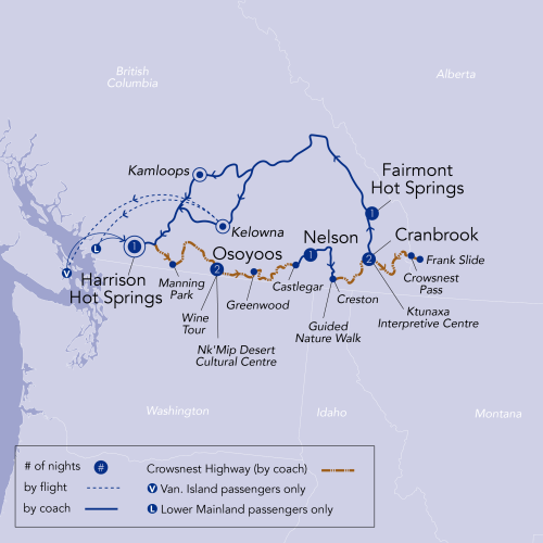 The Crowsnest is the legendary pass across the southern Canadian Rockies. The Crowsnest Highwaytraverses southern British Columbia from Hope into Alberta, often called Highway #3. This tour traverses the entire BC length of the Crowsnest Highway with a few scenic deviations. We start at the popular Harrison Hot Springs, then travel through Manning Park and Richter Pass to the Okanagan Valley for two nights on Osoyoos Lake. In the Kootenays, stops are made at Greenwood, the Doukhobor Centre, Nelson, Glass Bottle House, Creston Valley Wildlife Centre, and the brewery for Kokanee Beer. We dip into Alberta for a few hours at Crowsnest Pass to see the Frank Slide. Some interesting hotels are the historic Hume in Nelson, St. Eugene Resort, and Fairmont Hot Springs. Come and enjoy many experiences along the storied Crowsnest Highway.