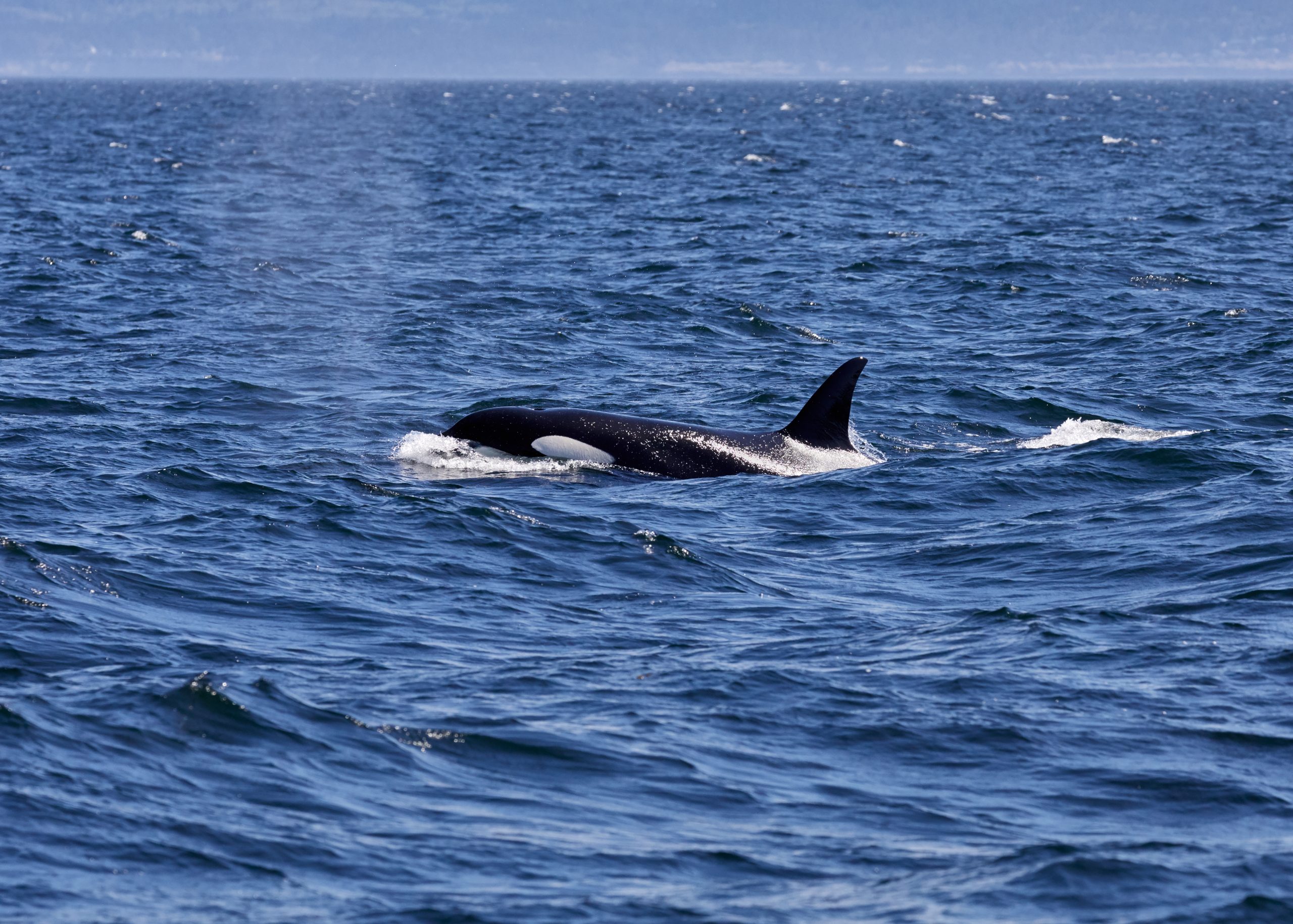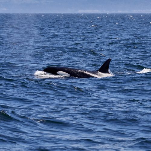 Pacific Explorer: Our charter vessel, Pacific Explorer, is licenced for 70, but this tour carries only 30 passengers for comfort. She has full-length tinted windows, indoor nook seating for everyone, washrooms, bar service, and an open-air viewing deck with bench seats and awning. She is 15.5 metres long and travels at up to 22 knots. The vessel is equipped with hydrophones to hear what is happening underwater and a certified marine naturalist is on board.