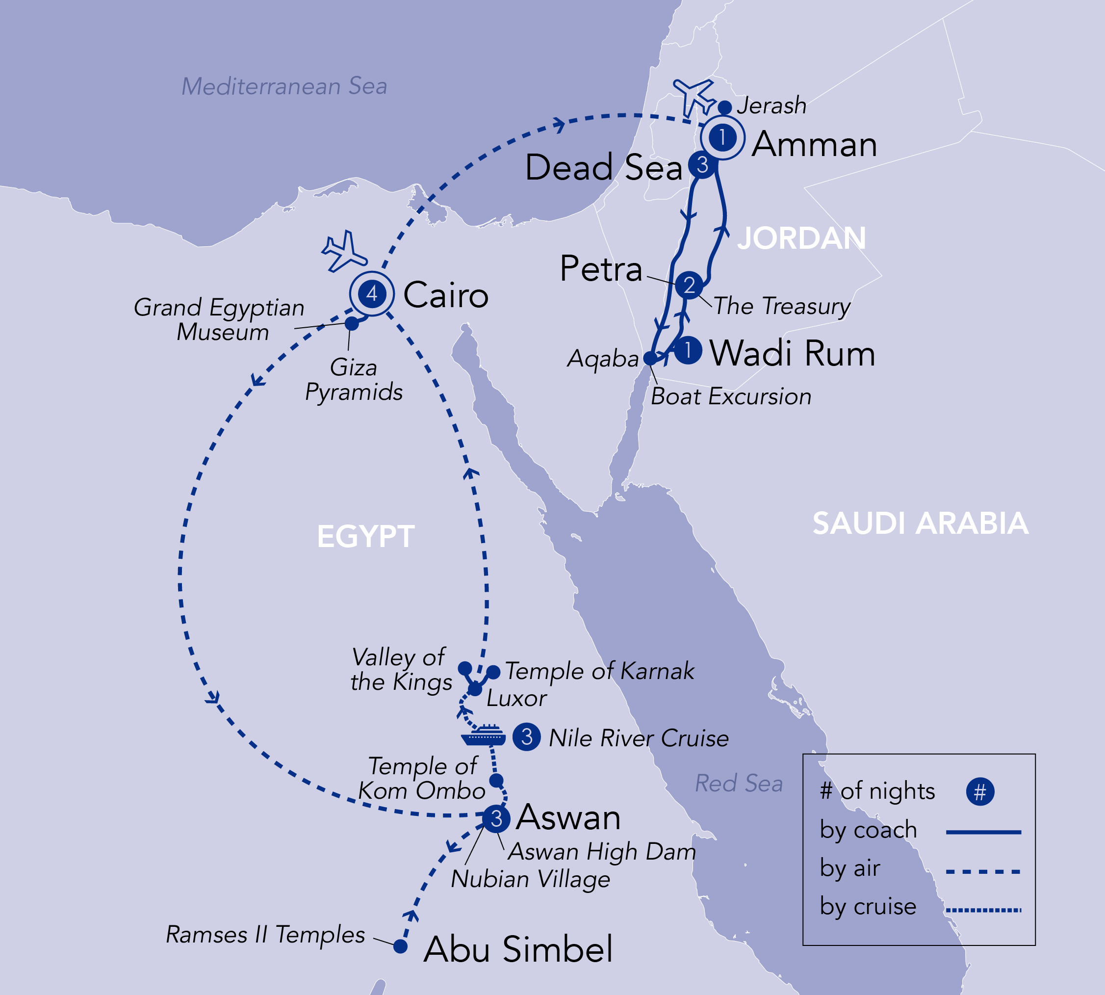 Photo Credits: Adobe Stock (Petra), Wikimedia (Abu Simbel, Wadi Rum) and tour director Marion (all others).