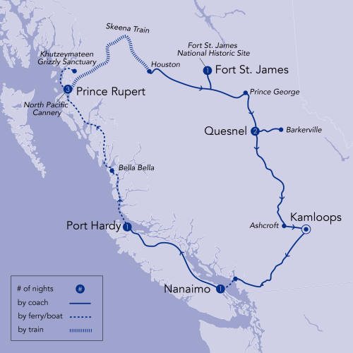 Explore the amazing North Coast by land and sea! The 500-kilometre journey from Port Hardy to Prince Rupert aboard BC Ferries’ Northern Expedition takes 15 hours, all in daylight to permit great viewing of the rugged coastline and abundant wildlife. In Prince Rupert, we thrill to a seven-hour catamaran excursion to the Khutzeymateen Grizzly Sanctuary and also tour the restored North Pacific Cannery. Then we board VIA Rail’s Skeena Train for a spectacular journey through the Coast Mountains to Houston. Fort St. James National Historic Site and the restored gold rush town of Barkerville are also included. What a wonderful British Columbia circle tour!