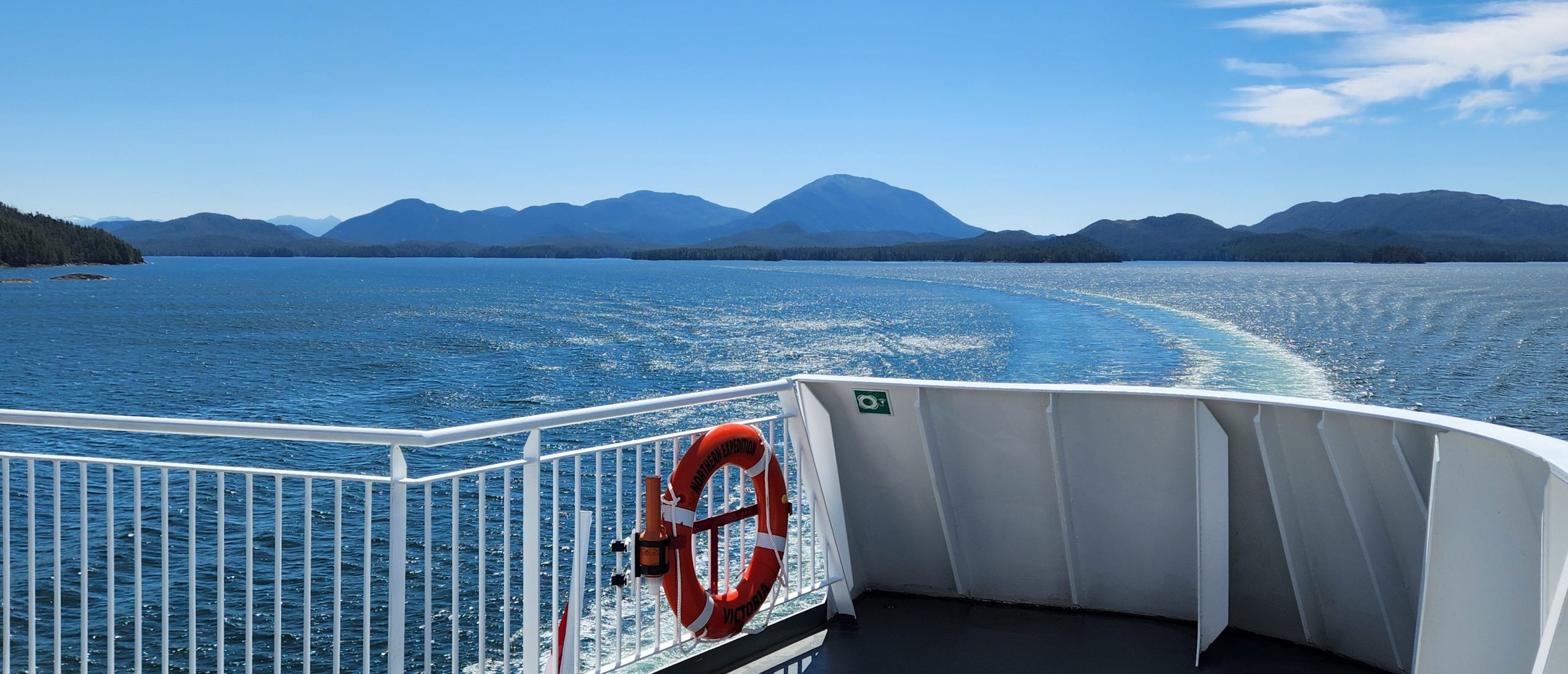 NORTHERN EXPEDITION: BC Ferries’ Northern Expedition was specially designed for Inside Passage voyages. Launched in 2009, she is 150 metres long with a beam of 23 metres and a draft of 7½ metres. She carries 130 vehicles, 600 passengers, and 30 crew at a travelling speed of 20.3 knots. The ferry has three passenger decks and an outdoor sun deck. Facilities include the Canoe Café, Vista Restaurant, gift shop, and Raven’s Lounge. A comfortable reserved seat in the private Aurora Lounge is included in your fare. The 500-kilometre journey from Port Hardy to Prince Rupert takes 15 hours, almost all in daylight to permit great viewing of the rugged coastline and abundant wildlife, marine life, and birdlife. Our motorcoach travels on the ferry, so luggage and other belongings can be stored there.