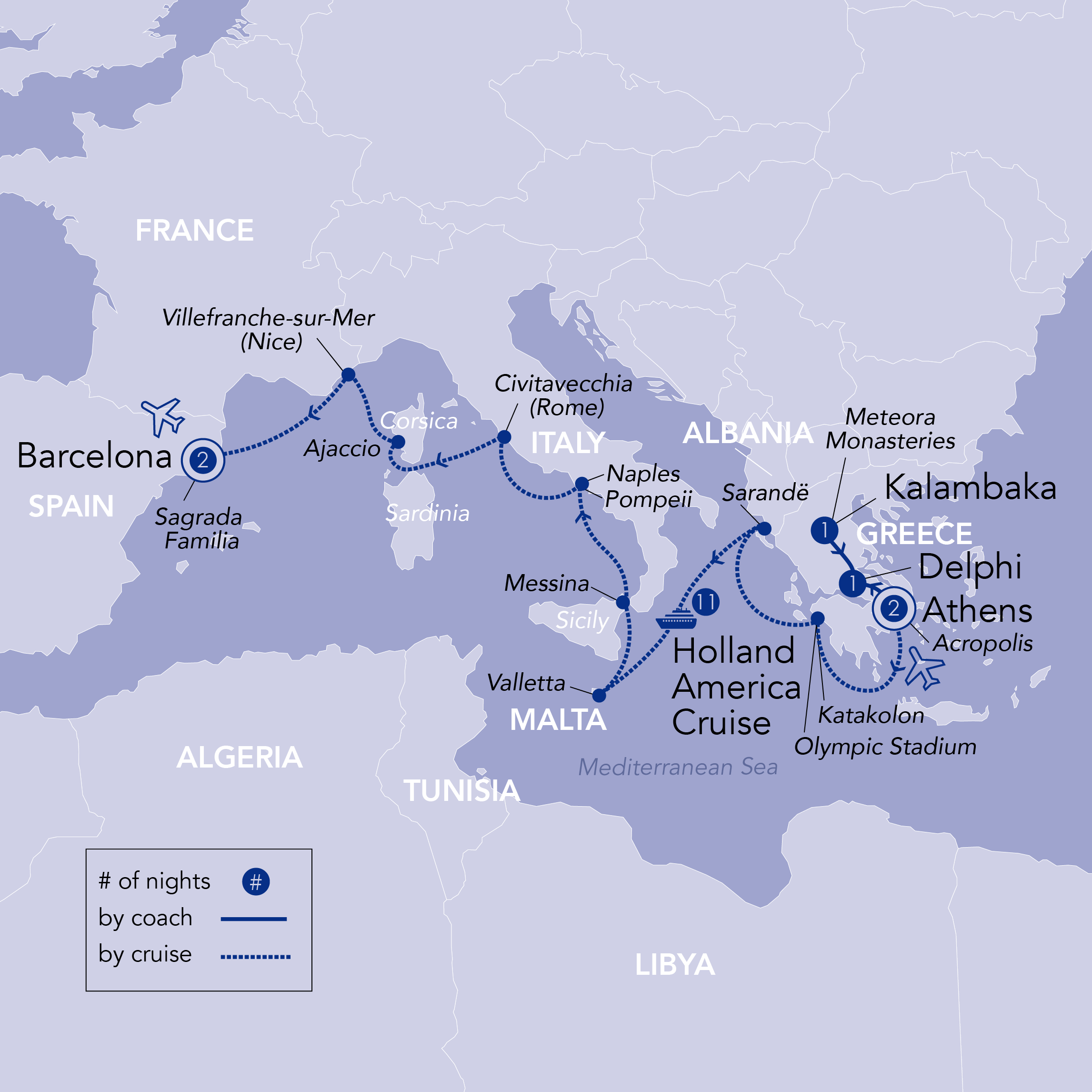 Photo Credits: Unsplash (Acropolis), Holland America Line (Oosterdam), Adobe Stock (Valletta, Malta, Acropolis close-up), Pixabay (Naples).