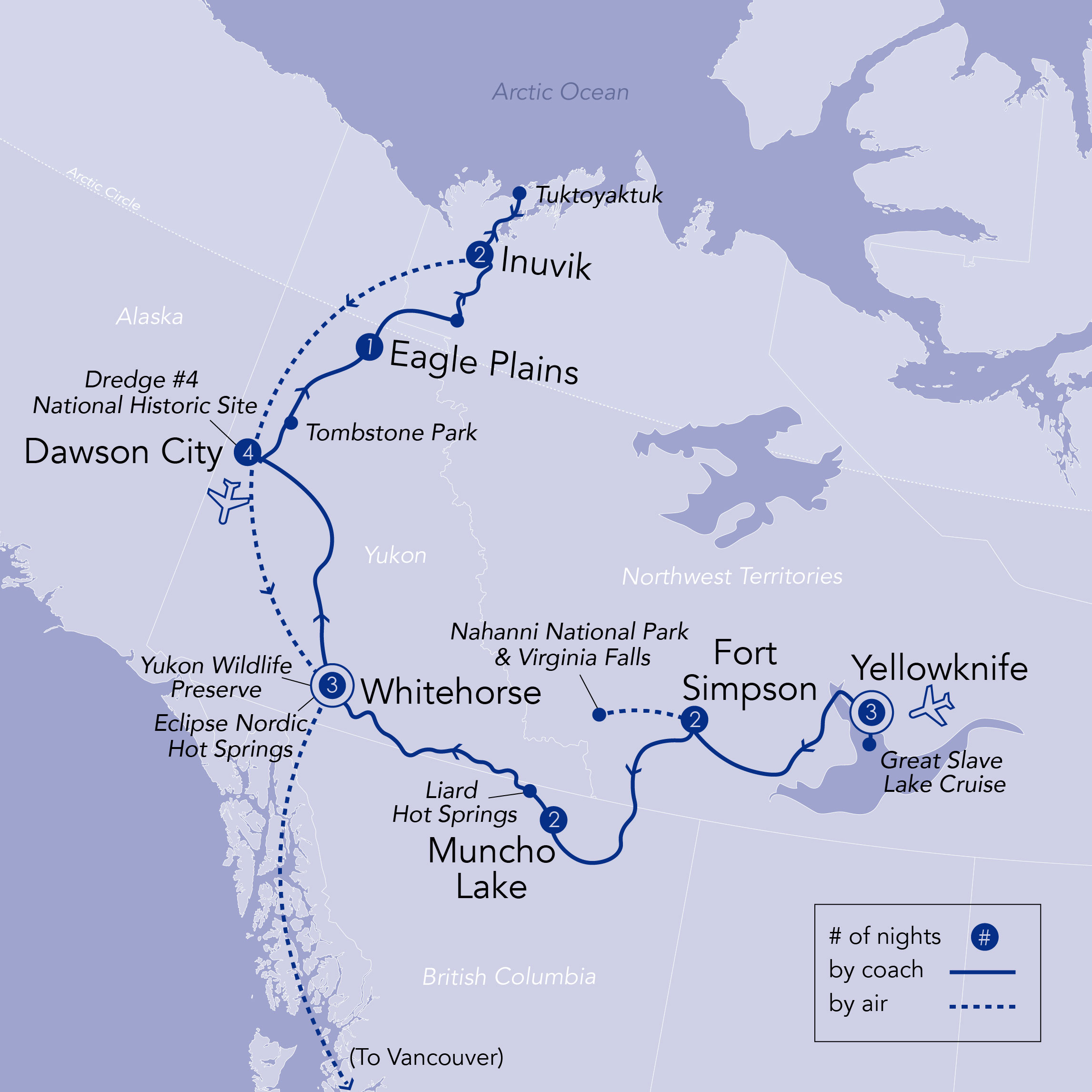 This epic journey to the Arctic Ocean has only been possible since the road to Tuktoyaktuk opened in 2017. Come and enjoy a great variety of sights and experiences in the Northwest Territories and the Yukon. Some of the many highlights are: Yellowknife, capital of the Northwest Territories; a boat trip on Great Slave Lake with a fish fry lunch served on an island, a scenic flight to Nahanni National Park landing at Virginia Falls, a swim at Liard Hot Springs and Eclipse Nordic Hot Springs, Dawson City with a show at Diamond Tooth Gerties, the storied Dempster Highway across the Arctic Circle to Inuvik, and a locally-guided tour of Tuktoyaktuk with a visit to an Inuit home and a presentation on Inuit fashions and lifestyles. What an incredible journey through the North!