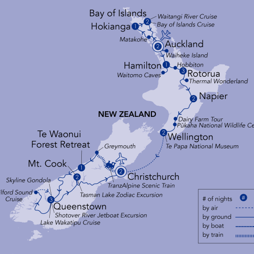 New Zealand consists of 2 major islands and about 600 smaller ones. The largest city is Auckland with 1.6 million people, and the second largest is Wellington. Otherwise, most of the country is rural. This leisurely tour has enough time for a comprehensive visit to the North and South Islands. We fly to Auckland and home from Christchurch via Auckland. Highlights on the North Island are a cruise in the Bay of Islands, the geysers of Rotorua, Waitomo Glow-worm Cave, the Hobbiton Movie Set, the Te Papa National Museum, and the beautiful capital of Wellington. The South Island is more rugged with high peaks, glaciers, and splendid coastlines. Highlights are the International Antarctic Centre, TranzAlpine train excursion, Sir Edmund Hillary Alpine Centre, Mount Cook, a Zodiac trip among the icebergs of Tasman Lake, and a cruise on Milford Sound. Some wonderful hotels are featured including the renowned Hermitage. Join Wells Gray Tours for an amazing itinerary around New Zealand!