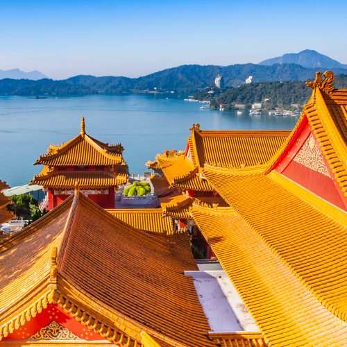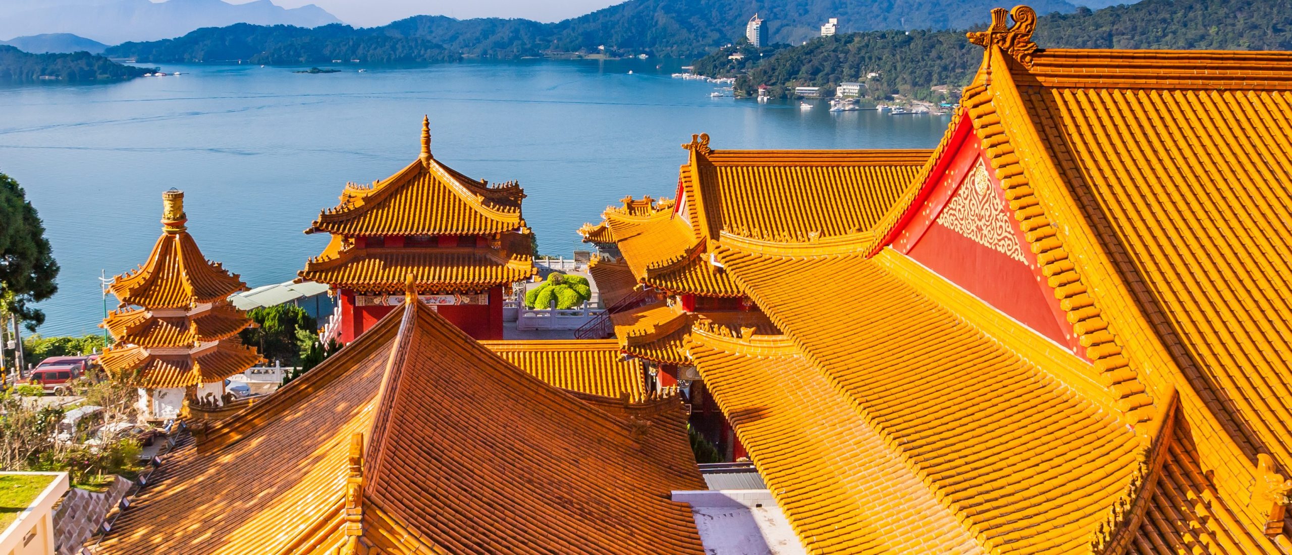 Photo Credits: Pixabay (Taipei, Yehliu Geopark, Chiang Kai-Shek Memorial Hall), Adobe Stock (Longshan Temple, Sun Moon Lake from Wenwu Temple, Taipingshan National Forest), and Wikimedia (Rainbow Village, Grand Hotel in Taipei).
