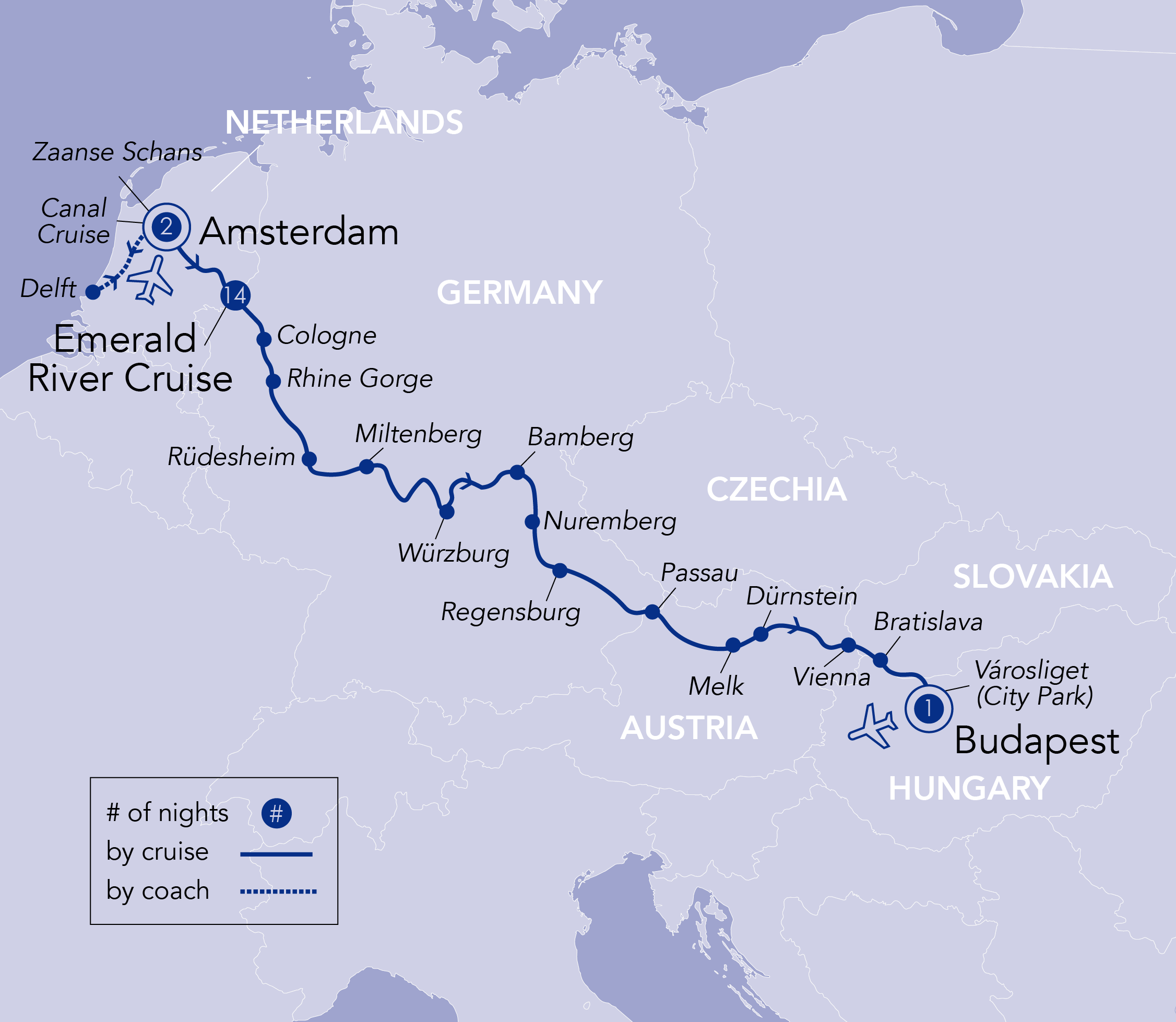 With 14 days on three European rivers and one canal, this amazing cruise on the brand new MV Emerald Astra takes in a wonderful variety of sights. After two days in Amsterdam, we board the ship and cruise upstream on the Rhine and the Main Rivers for six days. The Main-Danube Canal is 171 km long and our ship is raised or lowered through 16 locks during the three-day passage. The Danube is Europe’s second longest river, rising in Germany’s Black Forest and flowing through or along the borders of 10 countries to the Black Sea. Our cruise takes in a very scenic portion from Kelheim, Germany, to Budapest, Hungary, with five relaxed days to admire the vistas from the river. Savour fabulous cuisine, fine wines, exquisite suites, inspiring shore excursions, and the luxury of an Emerald ship.